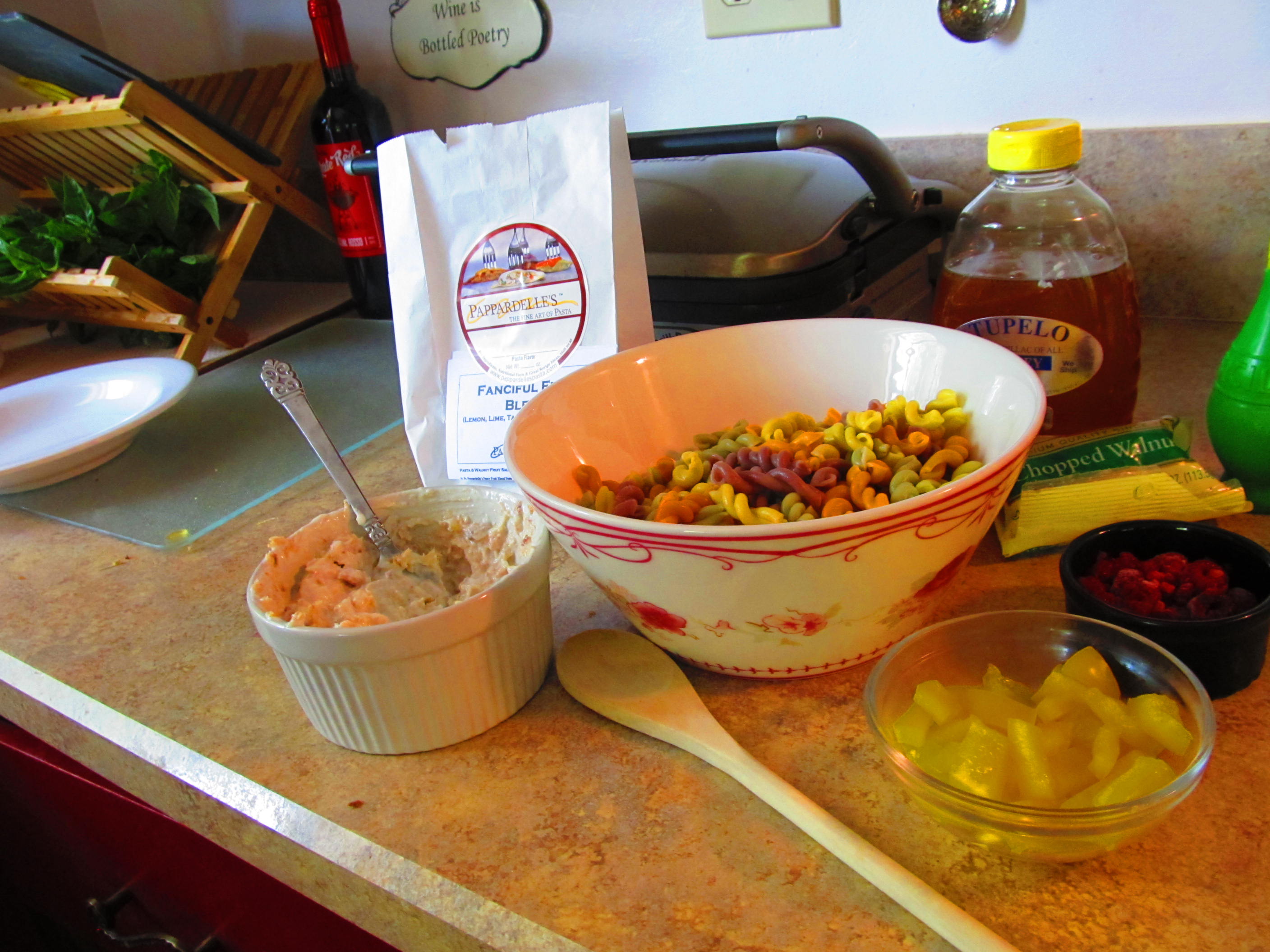 When I arrived home I reveled in my selections.  Fresh produce, gourmet cookies, an extremely aromatic bunch of fresh basil, and fruit flavored pasta.  I made a batch of tutti fruiti pasta and tuna salad using honey, greek yogurt, and some of the fresh goodies from my trip to the market.  It made for a delightful Sunday lunch.