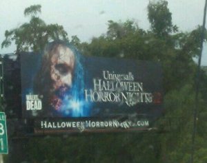 Yesterday and today marked the start of the 2012 Halloween billboards for the local theme parks.  Yesterday, while husband and I pulled into Universal Orlando we spotted our first Halloween billboard… but it wasn’t for Halloween Horror Nights, it was for Busch Garden’s Howl-o-scream.  It is quite amusing, nearly every year Busch Gardens snags a billboard for their Halloween event right in front of their biggest competitor.  However, I have to wonder just how effective doing this can be.  Halloween Horror Nights at Universal is without a doubt the top dog for Halloween events in Orlando.  Is placing a small billboard across the street from Universal Orlando property really that effective?  I suppose if Busch Gardens is willing to spend precious marketing dollars on it year after year then it is possible.