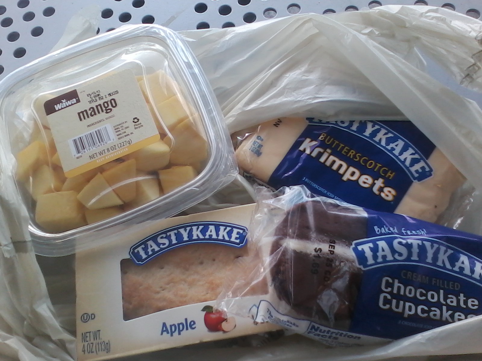 My personal favorite feature of the snacks offered at WaWa is the large variety of fresh food and sensible snack options.  In a tropical Florida mood I selected the chopped mango.  For husband and stepson, I decided to grab a small variety of Tastykakes to bring home.  I also saw a selection of Latin flavored chips, I wonder if they are exclusive to Florida…?  Any readers from the Northeast, please comment and let me know, please and thank you.