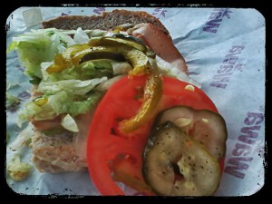 I walked outside to unravel my honey-roasted turkey hoagie.   After hearing WaWa’s TV ad during the morning news, every… single… morning, it was time for me to see what all the fuss was about.  At first unwrap I was surprised at the massive spill over of veggies that tumbled out of the sandwich.  After doing my best to restuff my hoagie, I took my first bite.  Pretty impressive.  Not Earthy shattering, world-altering good like I had anticipated based on all the social media buzz about WaWa and their hoagies, but still pretty good. The turkey itself had a great sweet flavor and I loved the sweet peppers.