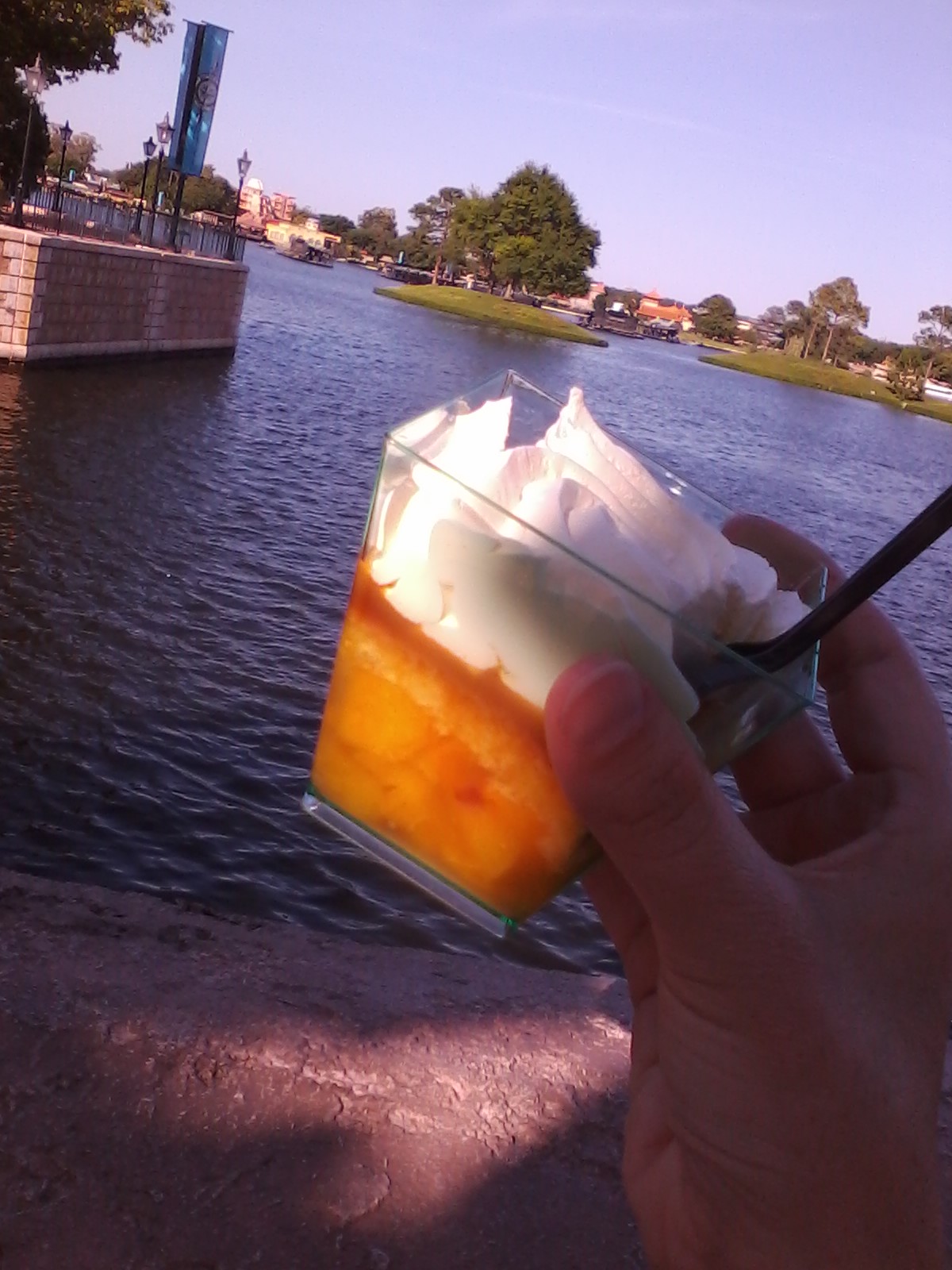 My first stop was L’Orangerie, the booth in the France pavilion, for dessert. The only item I had yet to try here was the peaches with rosemary and light vanilla cream. With a handful of chilled, sweet goodness I strolled over to one of my favorite spots in the France pavilion. This is one of Epcot’s most picturesque and romantic pavilions. I stood by the waterside, away from the strolling crowd. My first bite consisted mostly of the light vanilla cream which was very similar to whipped cream, but thicker and yet more delicate. Upon tasting the second bite, the distinct flavor of rosemary was both pleasurable and shocking. I had never experienced the sweet and juicy flavor of peaches with the earthy, herb of rosemary.