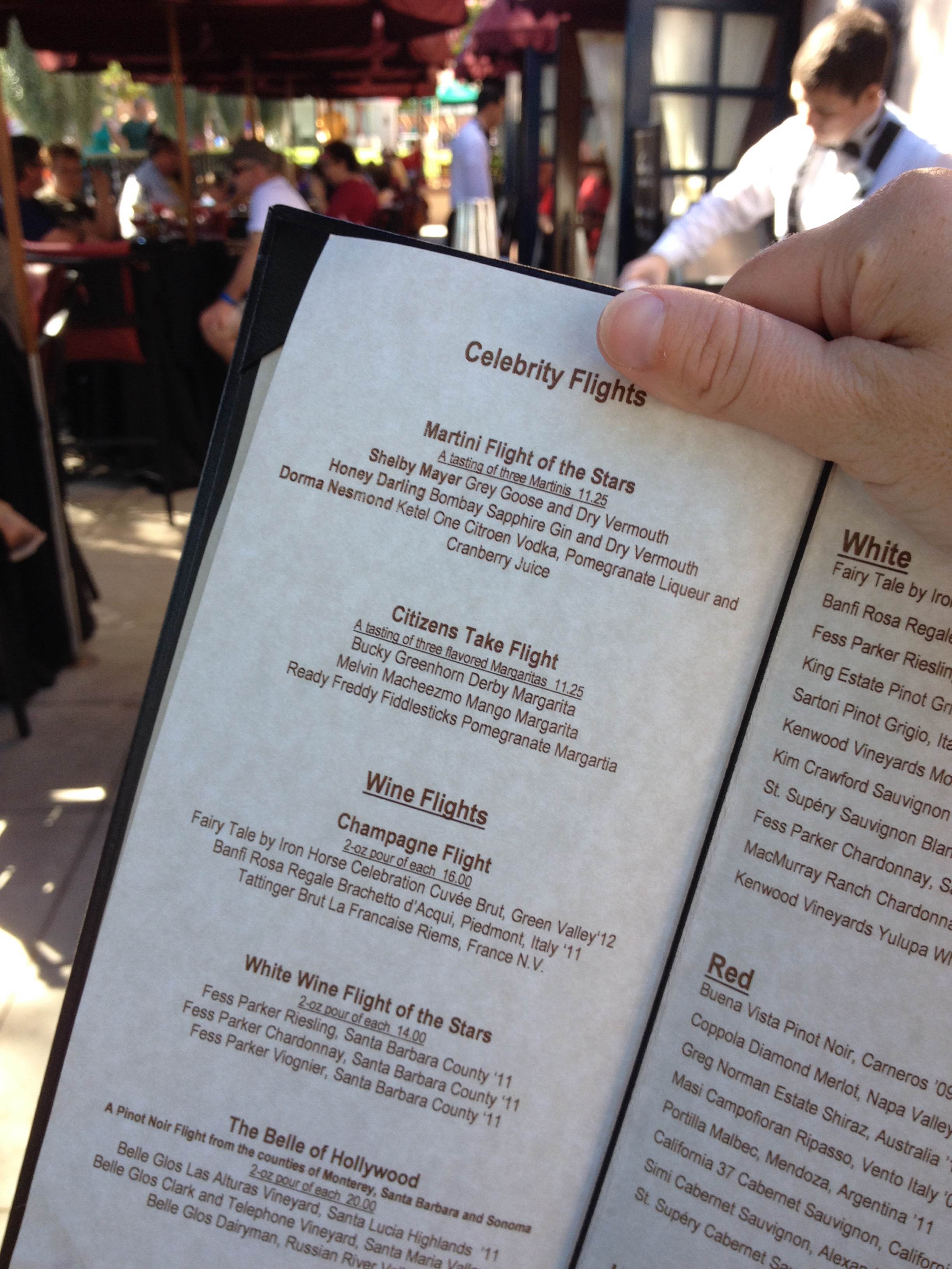 Browsing the menu, I immediately became delighted at the cocktail choices. Classic Hollywood glamour, and there are drinks named after the park’s beloved “streetmosphere” characters, the Citizens of Hollywood. We opted for the martini flight and the Ben Apetit (a light and lovely concoction of lemonade, gin, and other liquor). Each cocktail was lovingly made by a superb bartender, Aaron from England. He was marvelous and so friendly! Plus, he may have converted me from vodka martinis to gin! Also have to give props to our server, Danielle.