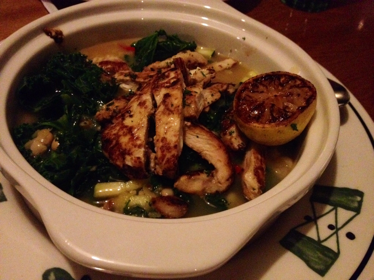 Chicken Abruzzi (Lighter Italian Fare [under 575 calories]) – Grilled chicken breast in a savory broth simmered with cannellini beans, kale and garden vegetables. I am very pleased with the offerings on the Lighter Fare section of the menu. I believe this is where I felt most comfortable, I wish the tasting event provided just one more selection from this portion of the menu. I really enjoyed this dished, though I wish I had not squeezed the lemon into the broth, it made it a little too tart.