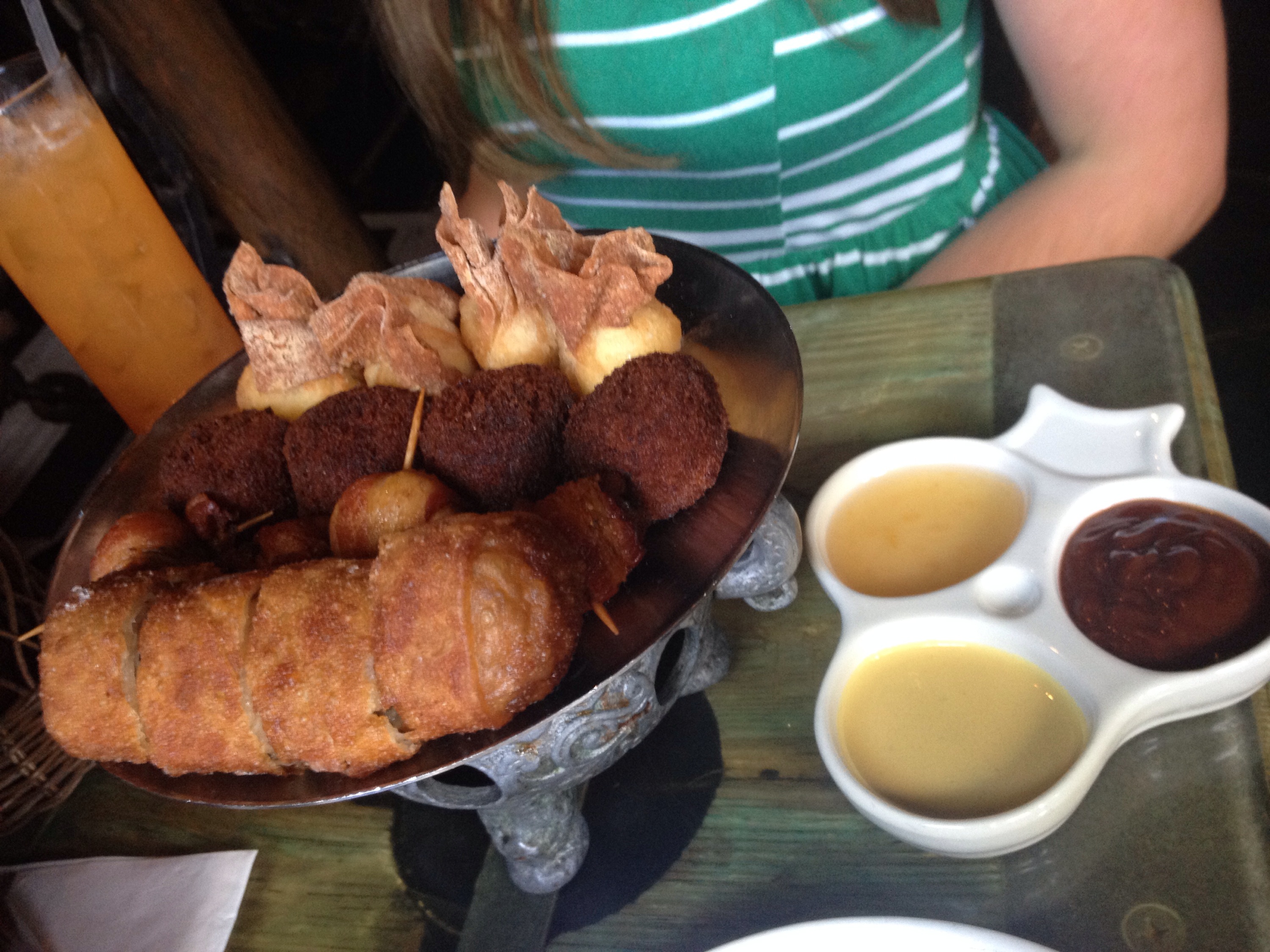 Our table was the smallest dining table I’ve ever set eyes on, but we were in a great corner where water flowed in and a seating area like the bow of pirate ship loomed next to us. We could see the entire bar before us. To my absolute surprise and delight we learned that we had made it to happy hour! Practically every single drink was half off!