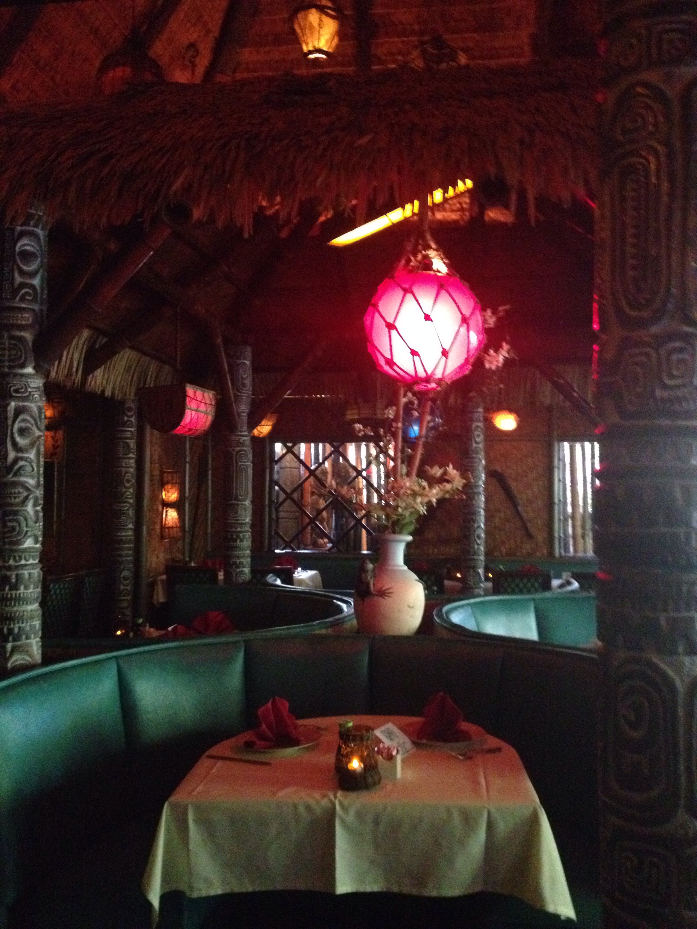 My eyes immediately grew as wide as saucers. Everything I had ever imagined about a real, authentic Polynesian tiki bar lay before me. Palm fronds created a thatched room along the bar itself. Nautical details seemed to cover every last inch of the room. Incredible light fixtures of all shapes and colors cast a low, relaxing light. The sun peeked through the water that flowed along the surface of every window, adding to the illusion that we had all entered an enchanted and exotic land.