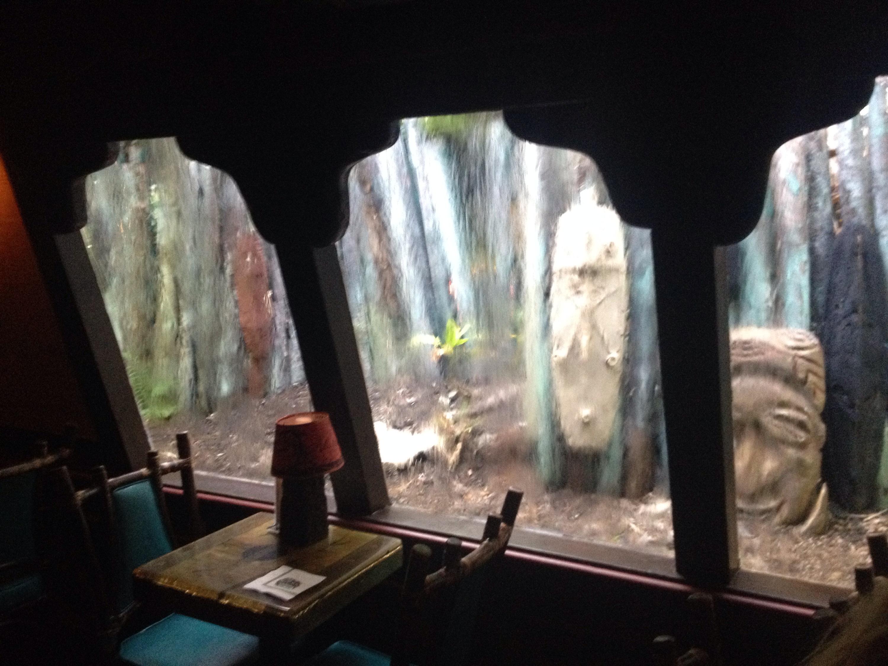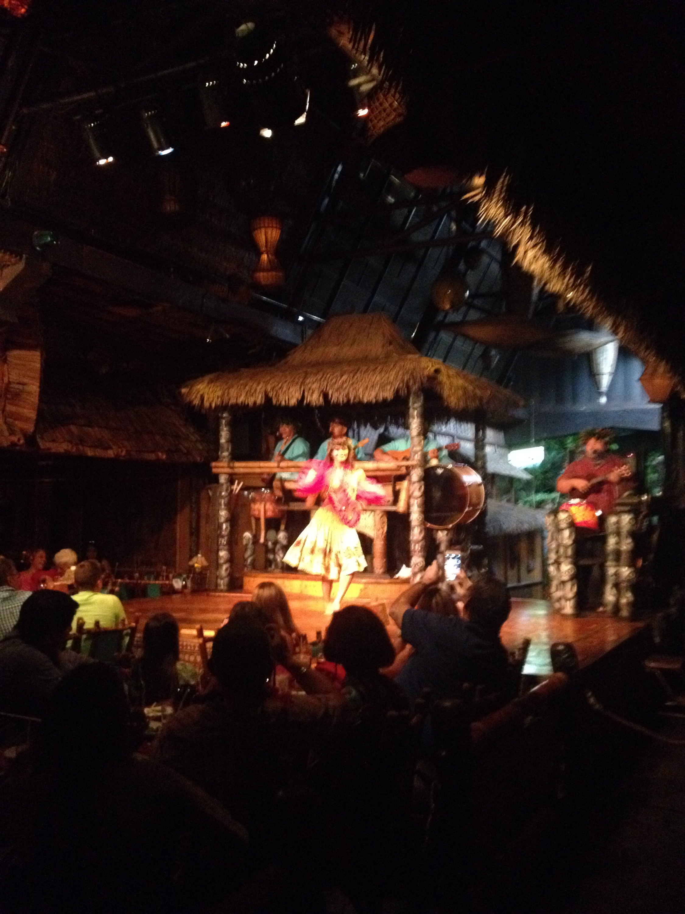 Each dining room named after a different Polynesian isle or tiki god, surrounds a larger dining hall with a stage at the front of the room and cascading waterfalls and caverns. I enjoyed seeing practically every room filled with delighted guests, enjoying themselves. Our generous new friends lead us outside to stroll through the winding walkways of the gardens. Tiki statues and totems peeked through the lush flowers as waterfalls cascaded down rocks and caverns. It was enchanting.