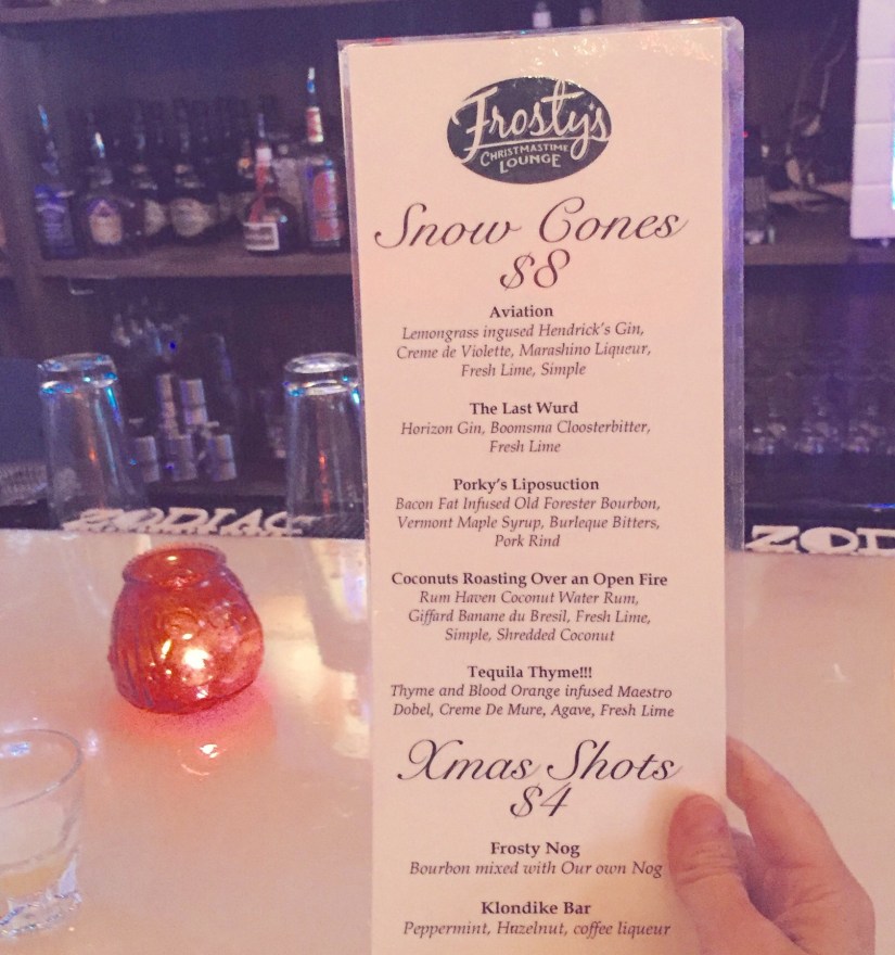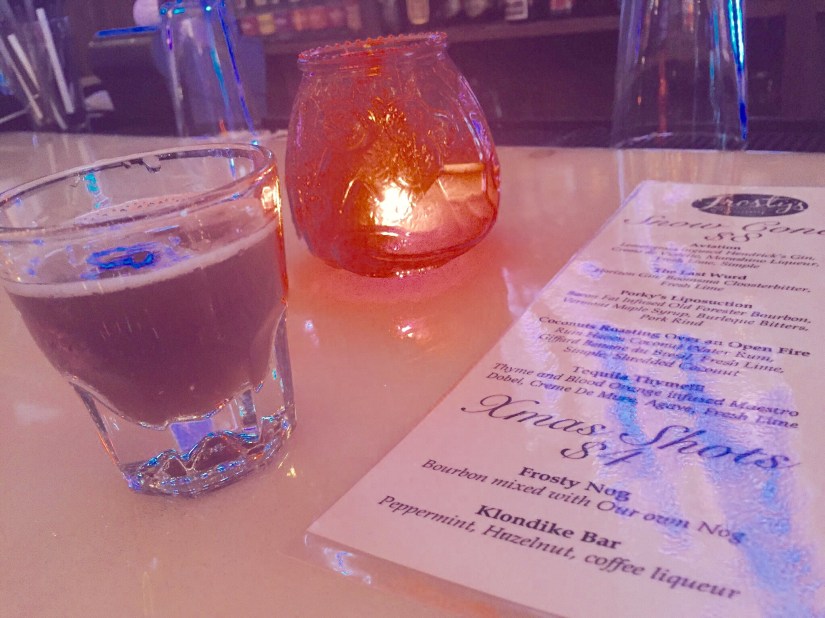 I’d either go with Porky’s or try the Last Wurd on my next visit. My other friend was intrigued by the shots. Two are listed on the menu, $4 each. I took a sip both of them and would easily order either one again, loved them! Frosty’s Nog is simply their own special nog (much lighter than traditional egg nog) and bourbon. The Klondike Bar is peppermint, hazelnut, and coffee liqueurs.