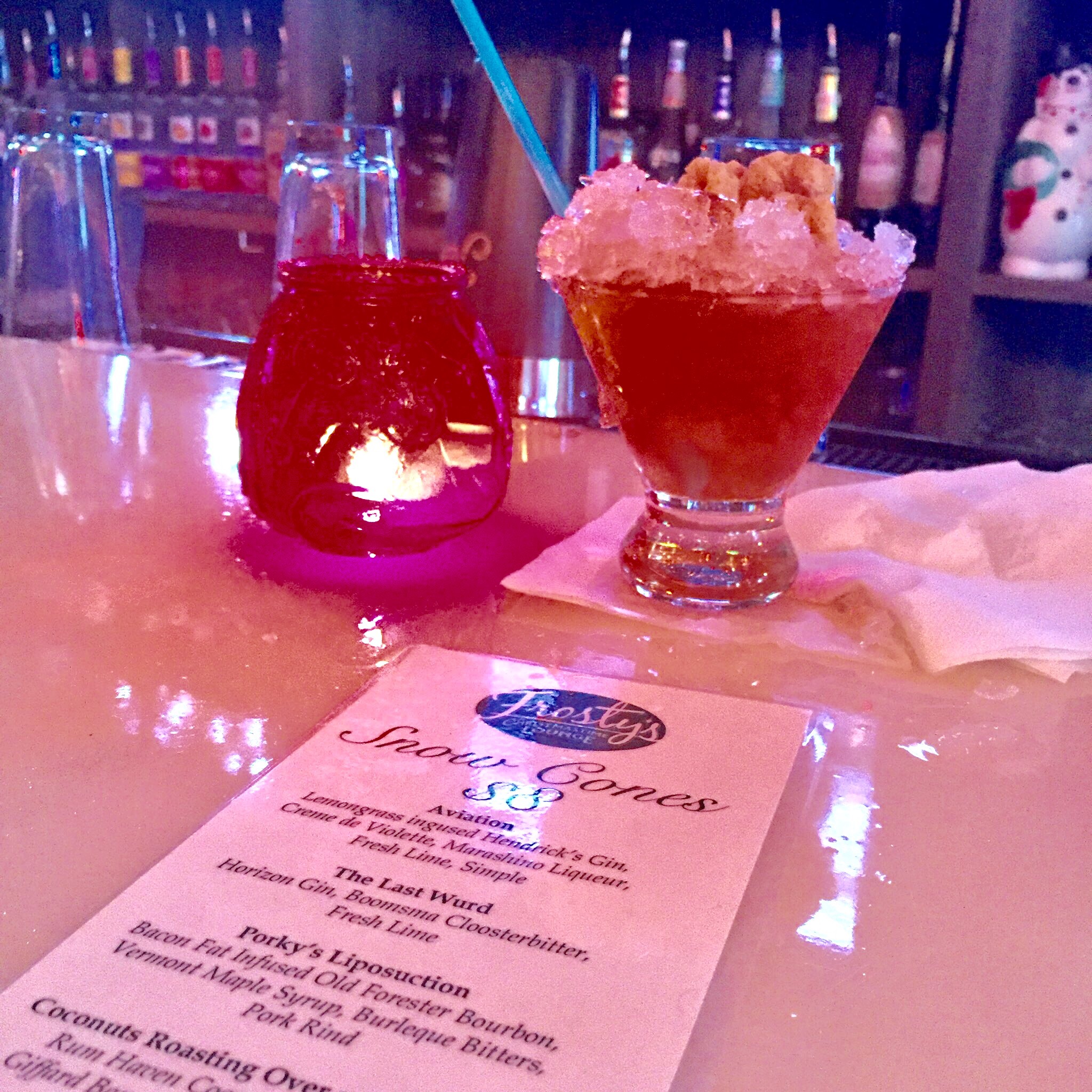Surprisingly, Frosty’s has a short list of specialty drinks and shots. There are five snow cone style drinks and two shots. The rest of the menu is bottled beer and three winter beers that are on tap all year.