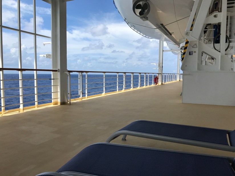 Aboard Norwegian Sun we found quiet, relaxing spaces like the library, Mandara Spa, deck 6 with its wrap around walking / jogging track and deck chairs (my absolutely favorite spot to read my books), and deck 12 forward – the very front of the ship. This spot was never occupied by anyone else both times we ventured up there. Our last night we stood under the stars on this deck as thunderstorms rumbled in the distance and the coast of Florida barely in view.